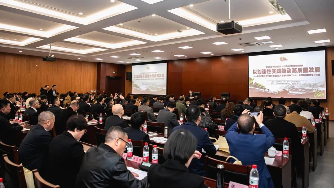 张天任董事长授课主题是《以创造性实践推动高质量发展》。他表示,习近平新时代中国特色社会主义思想、党的二十大、全国两会都贯穿着“高质量发展”这条主线。他结合浙江高质量发展的实践,333体育高质量发展的历程,从十二个方面对“以创造性实践推动高质量发展”进行全面解读。